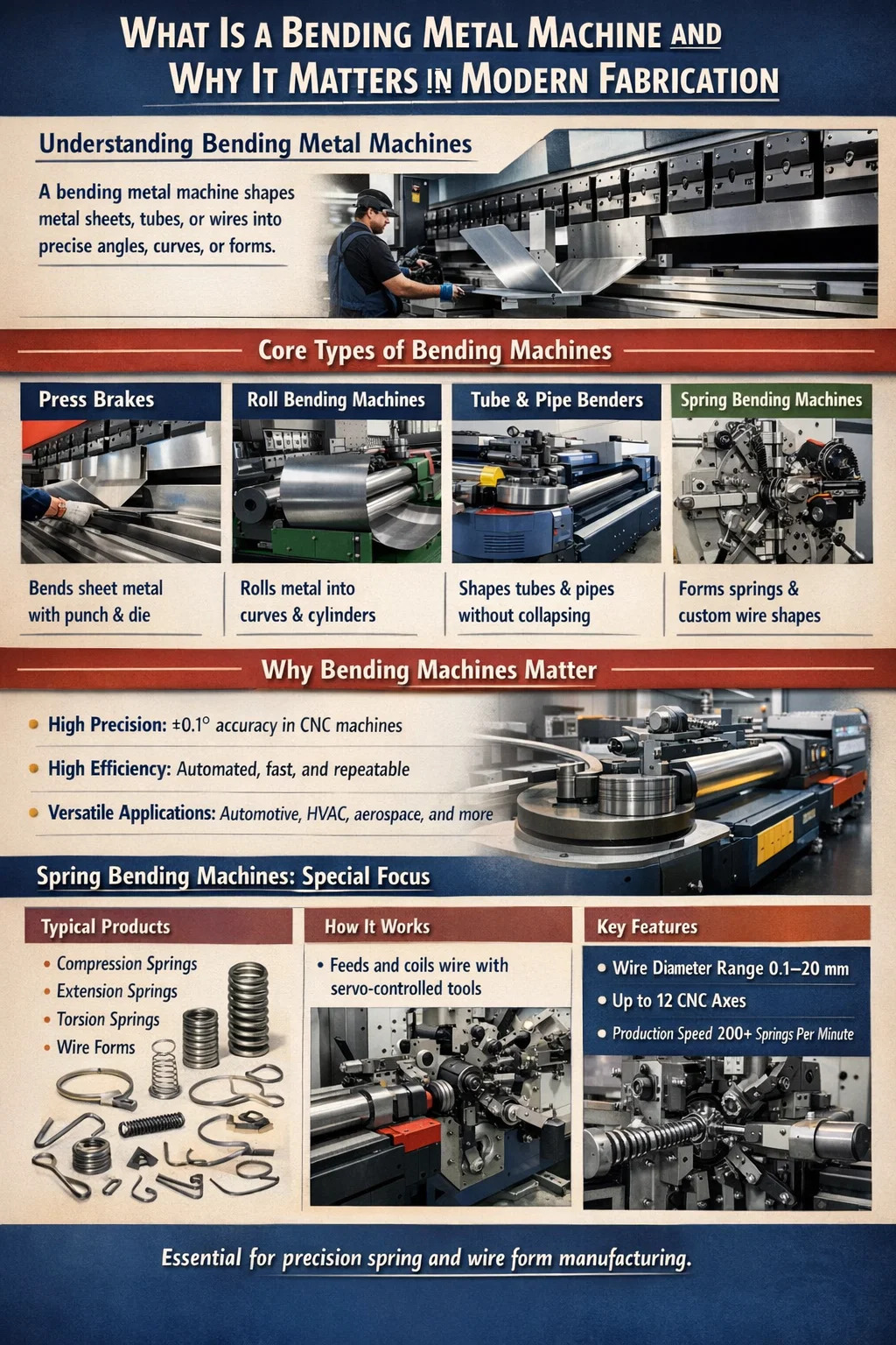 เครื่องดัดสปริงเป็นชุดย่อยเฉพาะของตระกูลเครื่องดัดที่กว้างขึ้น ในขณะที่เบรกกดทั่วไปเน้นที่แผ่นโลหะ ก เครื่องดัดสปริง ได้รับการออกแบบทางวิศวกรรมโดยเฉพาะสำหรับลม ขด และขึ้นรูปลวดหรือเหล็กเส้นเป็นสปริงอัด สปริงต่อขยาย สปริงทอร์ชัน และรูปแบบลวดแบบกำหนดเอง เครื่องจักรทั้งสองประเภทนี้มักจะอยู่ร่วมกันในโรงงานเดียวกัน และการทำความเข้าใจว่าทั้งสองประเภทส่งเสริมกันอย่างไรถือเป็นสิ่งสำคัญสำหรับการจัดหาอุปกรณ์ของผู้จัดการฝ่ายผลิต
