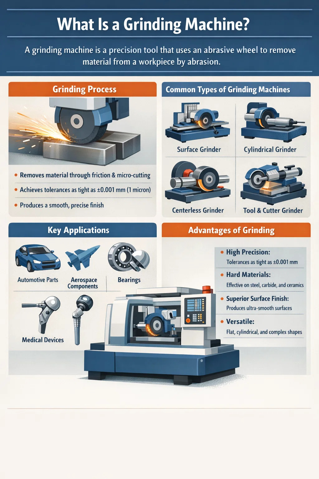 หลักการทำงานของเครื่องเจียรนั้นขึ้นอยู่กับ เครื่องจักรกลที่มีฤทธิ์กัดกร่อน — การกำจัดวัสดุเชิงกลโดยการเสียดสีและการตัดระดับไมโครด้วยอนุภาคที่มีฤทธิ์กัดกร่อน การทำความเข้าใจวิธีทำงานของกระบวนการนี้อย่างละเอียดช่วยให้ผู้ปฏิบัติงานเพิ่มประสิทธิภาพการเจียรและบรรลุผลลัพธ์ที่สม่ำเสมอ