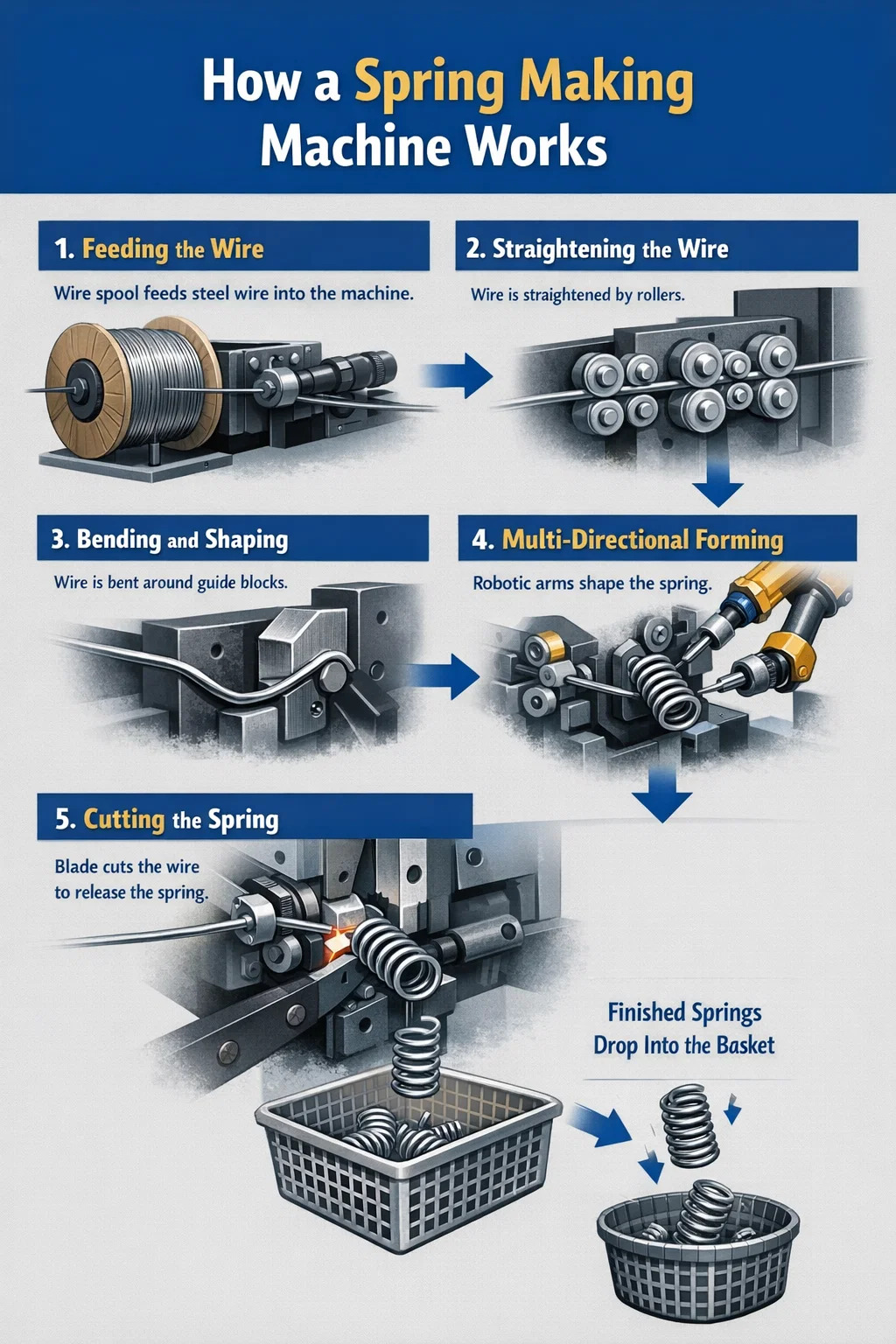 เราสามารถแบ่งขั้นตอนการทำงานของเครื่องทำสปริงออกเป็นหลายขั้นตอน: